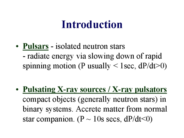 Pulsars (ie objects which emit radio pulses with very short periods) are isolated, highly magnetic neutron stars which radiate energy produced in the slowing down of their rapid spinning motion. Their rotational period is generally less than 1 second and the period is increasing with time.