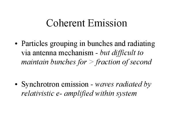 Coherent emission can be provided by particles grouping in bunches or clusters and radiating via an antenna mechanism. The phases of the radiation fields of the particles are not random, so the fields are summed. However, it is difficult, physically, to maintain these bunches for a fraction of a second or more.