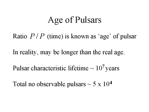 The ratio P/Pdot has the dimension of time and is often referred to as the age of the pulsar (assuming it was formed with a rotation period of a few millisec). For the Crab and Vela pulsars, the determination of the age of the pulsars was instrumental in associating the pulsar with the SNR.