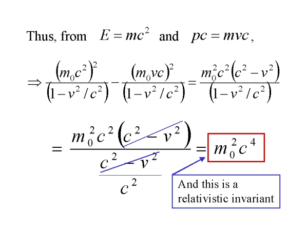 Thus we demonstrate that E^2 - (pc)^2 is an invariant, because a particle’s rest-mass, m_0, is independent of its velocity, v. Therefore in a collision, [E^2-(pc)^2] before is the same as that afterwards.