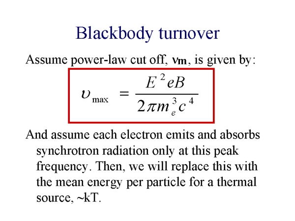 We assume that each electron emits and absorbs at the peak frequency shown in the equation above. Then the emitted intensity can be obtained by replacing the mean energy per particle for a thermal source (~kT) with the energy given by the equation above.
