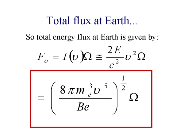 So to calculate the spectrum in the regime where the synchrotron emission would exceed the Rayleigh-Jeans flux, we assume that it can be described as a thermal source and replace the mean energy per particle (~kT) with the value of E at the peak frequency nu_max. Then to calculate the flux, the intensity has to be multiplied by the angle subtended by the source at the Earth, Omega.