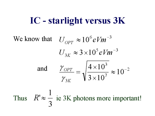 Substituting the numerical values given and those we calculated on slide 42, we find that this ratio is about 1/100, ie the 3K photons are more important in producing X-rays via the Inverse Compton process than starlight.