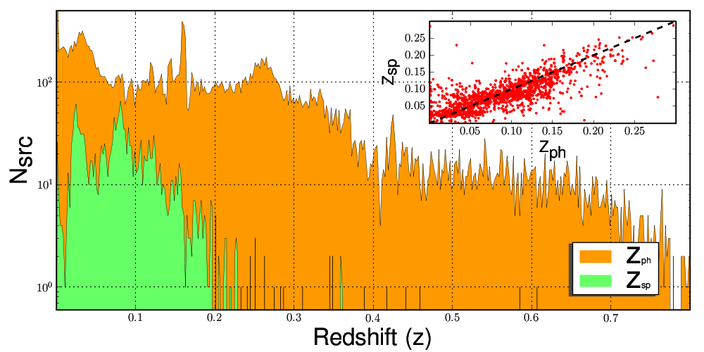 Source Properties: RedshiftsThe SDSS catalogue also contains up to two independent measurements of source redshift, a spectroscopic value and a less accurate photometric value. The redshift distributions of XMM-OM sources with SDSS DR6 extragalactic counterparts (nearest neighbour within 2 arcsec) are plotted in Fig 1 with sampling of Δz = 2 x 10-3. The spectroscopic redshift limit at z = 0.2 is a systematic consequence of the Sloan survey rather than intrinsic to the SUSS sample. It is not clear how real the photometric limit at z = 0.8 is, although the correlation between photometric and spectroscopic redshifts within the inset of Fig 1 indicates that photometric redshifts can be trusted to within few x 10-2 between 0.0 < z < 0.25.