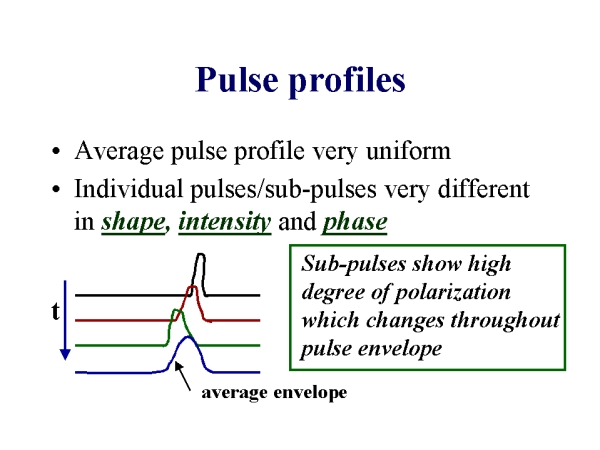 Generally, one studies the pulse profile integrated over a sequence of a few hundred pulses and this is very uniform. But individual component pulses or sub-pulses can be very different from one another, varying in intensity, shape and in the phase at which they occur within the integrated profile.