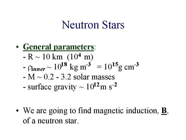 We are going to find the value for the magnetic induction of a neutron star by thinking of the Sun contracting with its magnetic field to form a neutron star. (Although is really not known where the magnetic field in a neutron star comes from).