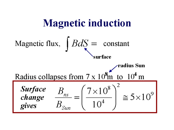 The integral of the magnetic field around the surface of the star must be a constant and the radius collapses from 7e8 m to 1e4m. Thus the ratio of the magnetic fields of the neutron star to the Sun is equivalent to the ratio of their radii squared… and this is approximately 5e9. So the magnetic field of a 1 solar mass neutron star is 5 billion times that of the Sun.