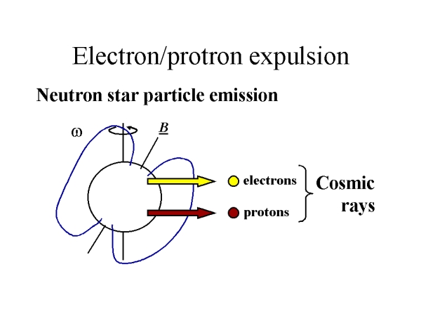 The potential difference on the scale of the neutron star radius is approx. 1e18 Volts. Electric potentials generated in this simple way are sufficient to overcome electrostatic binding forces, thus electrons and protons are expelled from the neutron star surface and are accelerated almost to the highest energies, ie in cosmic rays.