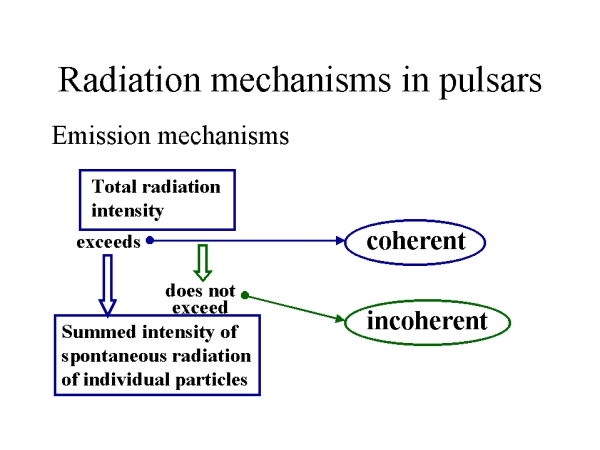 In astrophysical conditions, emission mechanisms can be divided into coherent and incoherent, depending on whether or not the total radiation intensity can exceed the summed intensity of the spontaneous radiation of individual particles.