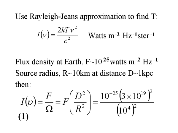 For the long-wavelength side of the radio peak, we use the Rayleigh-Jeans apporximation for a blackbody (top equation). Then assuming a radius for the neutron star of 10km and a linear distance to the source of about 1kpc, the intensity at the surface of the neutron star (ie if it were a blackbody source) would be that given by equation (1).