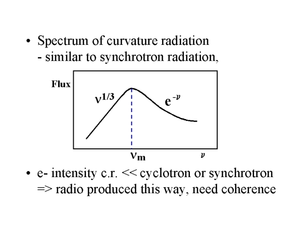 The spectrum of curvature radiation has the same form as that of synchrotron radiation, varying with the cube root of frequency at low frequencies and falling exponentially above the peak frequency.