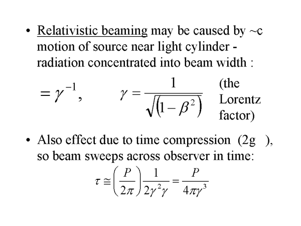 In addition, the relativistic motion of the source near the light cylinder may cause relativistic beaming of the radiation. In simple terms, the radiation is concentrate in a beam along the direction of motion, the beam width being approximately 1/gamma where gamma is the Lorentz factor.
