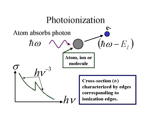 An atom, ion or molecule absorbs a photon and releases an electron with an energy equivalent to the energy of the incoming photon less the ionization energy for the level that the electron occupied.