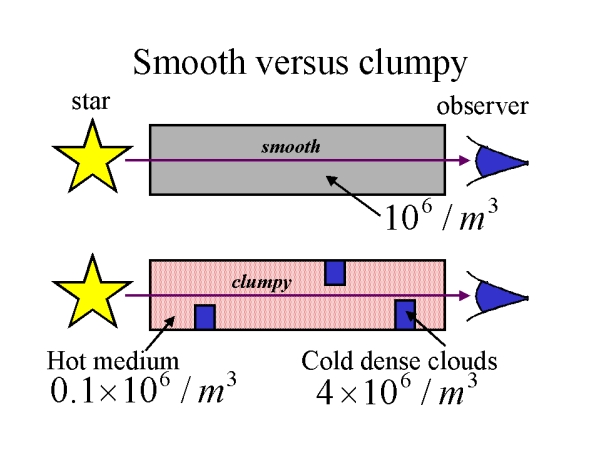 One of the problems, as I mentioned earlier, with measuring the amount of absorbing gas along our line of sight to a star, is that measurements of the 21cm line emission are made using a very wide beam, hence low spatial resolution. So it is not known whether there is any fine structure in the ISM or not. When we measure the 21cm emission at a certain position, we assume that this is for a smooth distribution of cold hydrogen gas. But in reality, we could be seeing the star through a gap in cold clouds which are suspended in a hot, low density medium. This makes a dramatic difference to amount of flux that is actually transmitted. And if the amount of absorption is overestimated because we assume a smooth distribution of hydrogen, then we calculate a much higher intrinsic luminosity for the source than is actually the case.