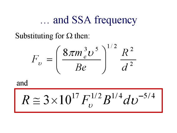 Substituting for Omega into the previous SSA equation in terms of F_nu, we derive the expression above. Then re-arranging and inserting values for numerical constants we find the expression for R shown.