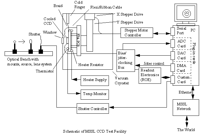 Above is a block diagram of MSSL’s CCD Test Facility, which is situated in MSSL’s class 100 cleanroom. The CCD and its FPA card are mounted on an X-Y stepper motor system in a vacuum chamber and the CCD is cooled using a flexible attachment to a LN2 reservoir which is built into the chamber. A window in the chamber wall permits the CCD to be illuminated from outside the chamber. This allows various optical setups to be used and changed (e.g. pinpoint illumination, flat-field, focussed image) without disturbing the CCD. The window and optical bench are in a dark enclosure to eliminate external light. The X-Y stepper system allows the CCD to be moved in the optical beam to expose different areas of the CCD to the same optical flux, e.g. to perform flat-fielding, and also allows a calibrated photodiode to be placed in the beam for flux measurement.