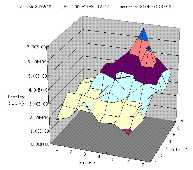 IDL>plot_image, reform(((RESULT(3,*,*)-RESULT(6,*,*))*RESULT(5,*,*))/((RESULT(0,*,*)-RESULT(6,*,*))*RESULT(2,*,*))) A procedure is available here (gt_ratio.pro) which contains all the steps necessary to detemine the density. A saved fit array is also needed and can be found here (fit_fe13.sav). If you also like to have an example, you may also download this (fe13.txt).