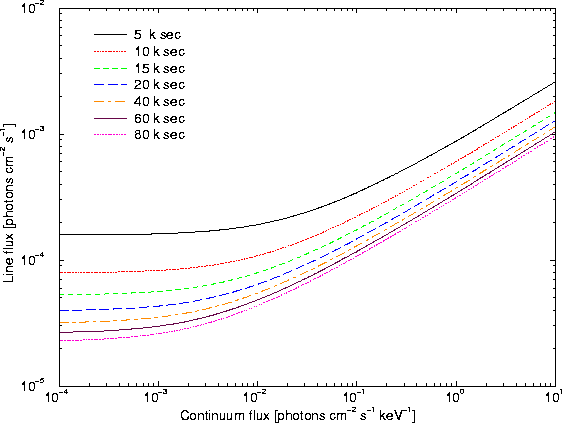 The X-ray background varies over the sky. In order to provide a graphical representation of RGS's sensitivity which is independent of the source coordinates on the sky, the X-ray background was not considered directly. However, at the discussed energies the extragalactic X-ray background can well be reproduced by a power-law spectrum. This allows us to consider the X-ray background simply by adding an additional component to the continuum flux of the source. In general, the ``continuum flux'' in the plots can therefore be assumed to contain in practice a contribution from both the source continuum and the X-ray background at the position of the source.