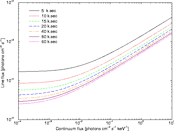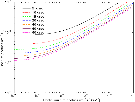 The particle-induced background, which depends on the design of the instruments, is considered in the calculation of the curves. We assume a particle-induced background of $3.0\times10^{-9}$ counts mm-2 s-1 keV-1. This is a mean number, which accounts for the normal fluctuation in solar activity. For the given lines we assumed a geometrical area for particle hits of 7.2, 10.8 and 12.5 mm2.