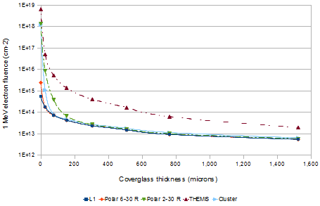 In SPENVIS, the EQFLUX program calculates 1 MeV electron and 10 MeV proton damage equivalent fluences using data from the solar and trapped particle models. The 10 MeV proton fluence is then converted into the equivalent 1 MeV electron fluence (by using a proton/electron damage factor of 3,000) and added to the total electron fluence. We assume that the coverglass is made of fused silica with 2.20 g cm-3 density (which is usually the case) and single junction GaAs cells which have a better efficiency than the standard silicon-based cells. We only focus on estimating the degradation of the output power since the degradation of short-circuit current and open-circuit voltage is approximately proportional and can be obtained by applying damage ratios. The results are given in terms of the equivalent 1 MeV electron fluence as a function of the coverglass thickness for different orbits. THEMIS and Cluster orbits are also included for comparison, as previously.