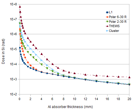 The following image shows a graph of TID as a function of aluminium shielding for the different orbits considered for AXIOM, as well as for the orbits of two other space missions — THEMIS [7] and Cluster [8] (for comparison).