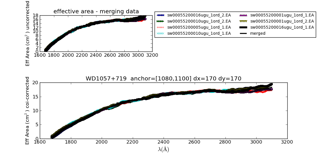 The differences are easily visible in the normalized plot below. Remember that the errors are not include in the plot below, though the differences are clearly visible as a change of the whole effective areas. A linear interpolation has been used. The bumps above 3000A are most likely due to faint background sources and only a limited number of spectra used for similar roll angles.